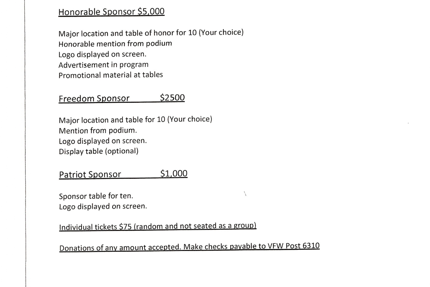 NOVEMBER 13, 2025 - 3RD ANNUAL VFW POST 6310 "LET FREEDOM RING" AWARDS LUNCHEON AT PEBBLE CREEK - TUSCANY BALLROOM ON 16262 CLUBHOUSE DRIVE, GOODYEAR, AZ. LUNCHEON BEGINS AT 11:30 A.M. TO 1:30 P.M.PURCHASE INDIVIDUAL TICKETS FOR $50 (RANDOM SEATING)MAKE CHECKS PAYABLE TO VFW POST 6310 LUNCHEON, P. O. BOX 1178, TOLLESON, AZ.FOR MORE INFORMATION CALL JENNIFER SLANE AT 480-359-7541 OR AT FISHBONE10868@GMAIL.COM.ON THE 4/17/25 - POST 6310 MEETING AT 10051 WEST VAN BUREN, TOLLESON, AZ. POST MEETING WILL START AT 6:00 P.M. AT THIS MEETING ADDITIONAL NOMINATIONS FOR POST OFFICERS FOR 2025-2026 WILL BE HELD. AFTER THE APRIL NOMINATIONS HAVE BEEN CONCLUDED, AN ELECTION WILL BE HELD. POST OFFICERS ELECTED IN APRIL WILL BE SWORN IN AT THE MAY 15, 2025. THEY WILL OFFICIALLY TAKE THEIR OFFICE AFTER THE JUNE 8, 2025 COUNCIL OF ADMINISTRATION MEETING TO BE HELD AT VENTANA CANYON RESORT IN TUCSON.